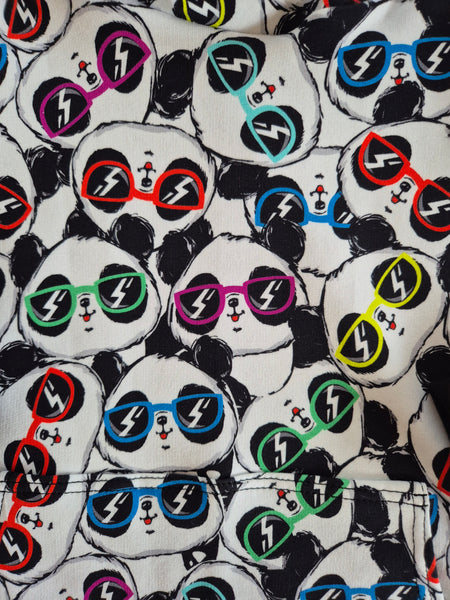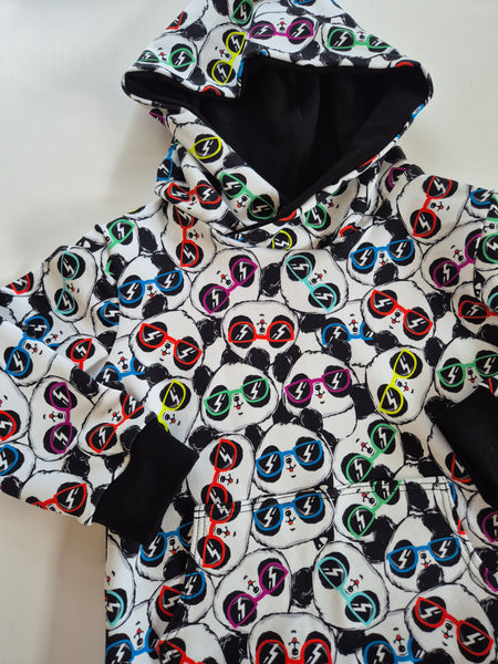 Organic Panda Hoodie is covered in Pandas in sunglasses with black trim and cuffs.